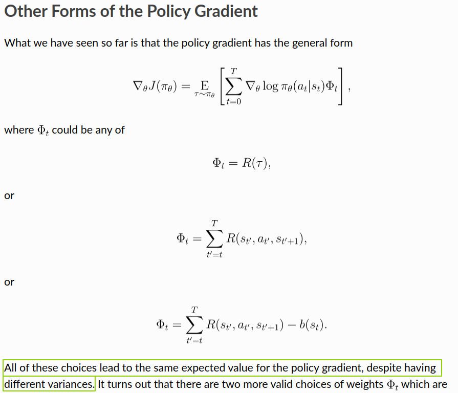 As shown above, all forms can provide reasonably accurate, roughly unbiased gradient estimates, but they have different variances. Statistically, we want the variance to be as small as possible without sacrificing too much accuracy, because that usually leads to better sample efficiency, better optimization efficiency, and more stable training.