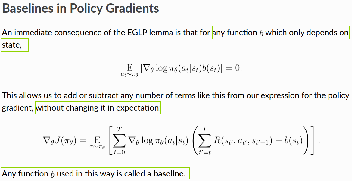 Here I want to spend a bit more time on the idea of a baseline. The main reference is OpenAI’s Intro to Policy Optimization.